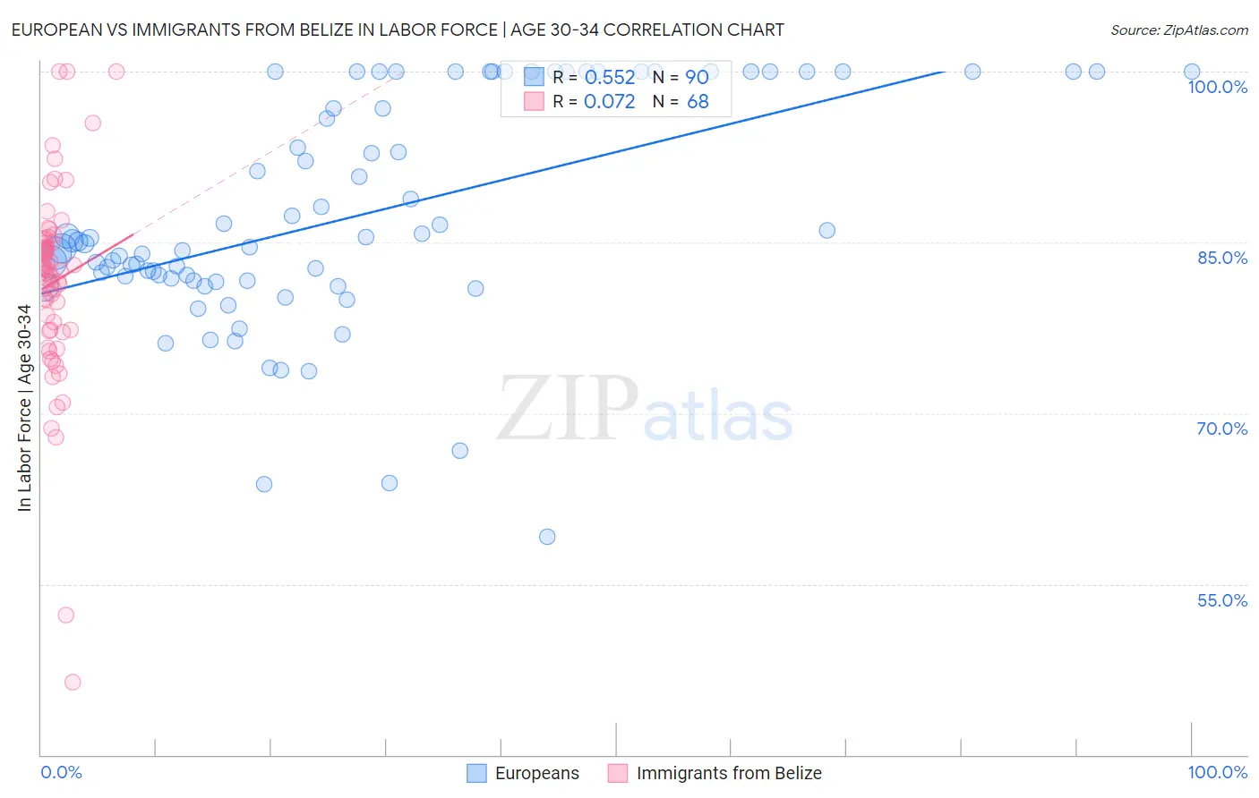 European vs Immigrants from Belize In Labor Force | Age 30-34 Correlation Chart