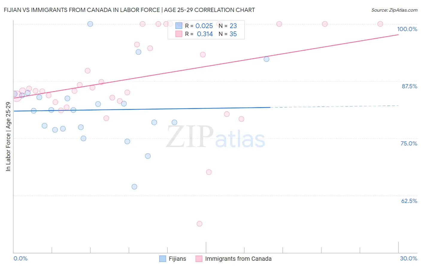 Fijian vs Immigrants from Canada In Labor Force | Age 25-29 Correlation Chart