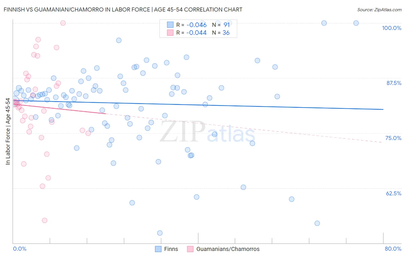 Finnish vs Guamanian/Chamorro In Labor Force | Age 45-54 Correlation Chart