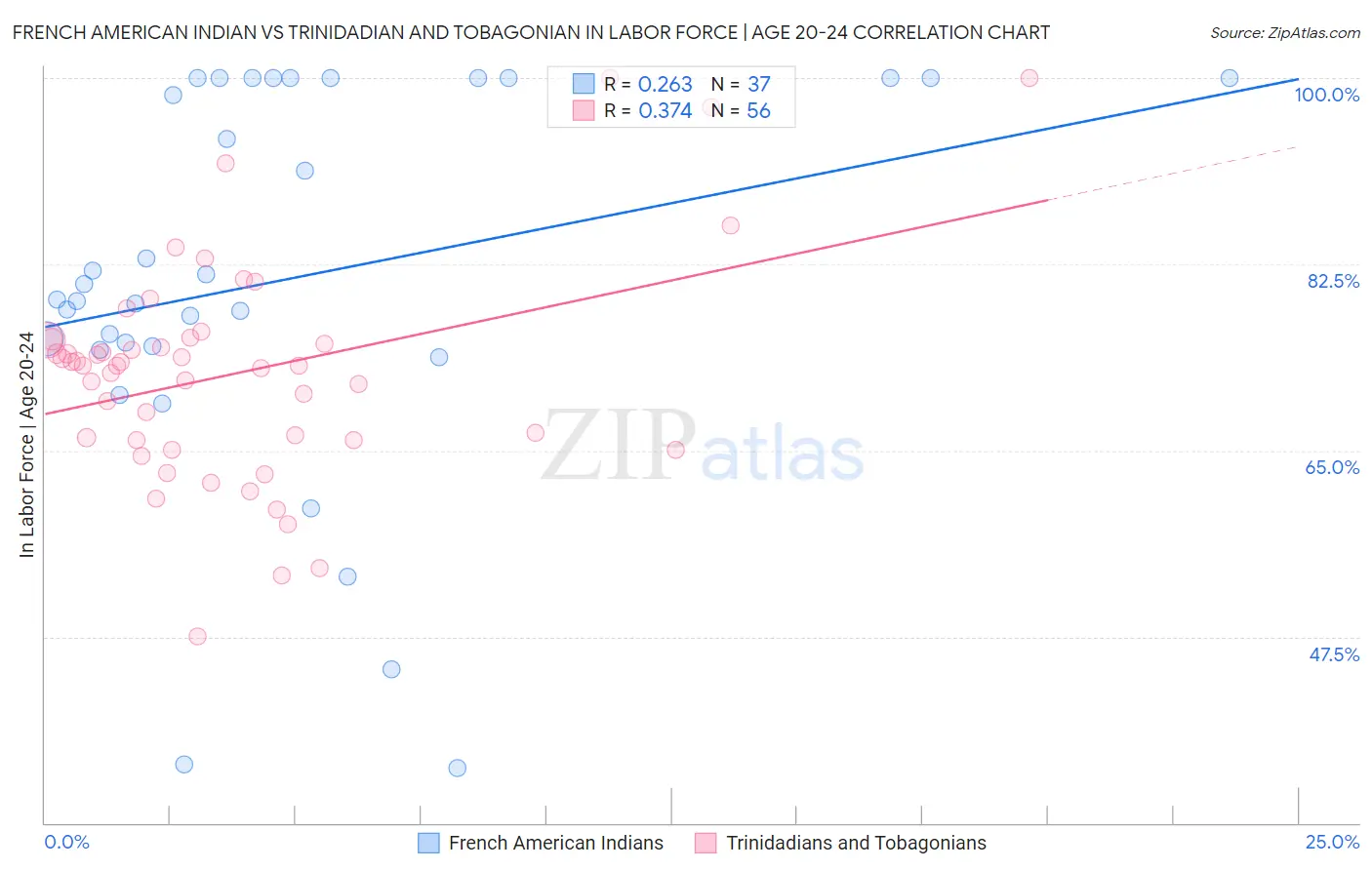 French American Indian vs Trinidadian and Tobagonian In Labor Force | Age 20-24 Correlation Chart