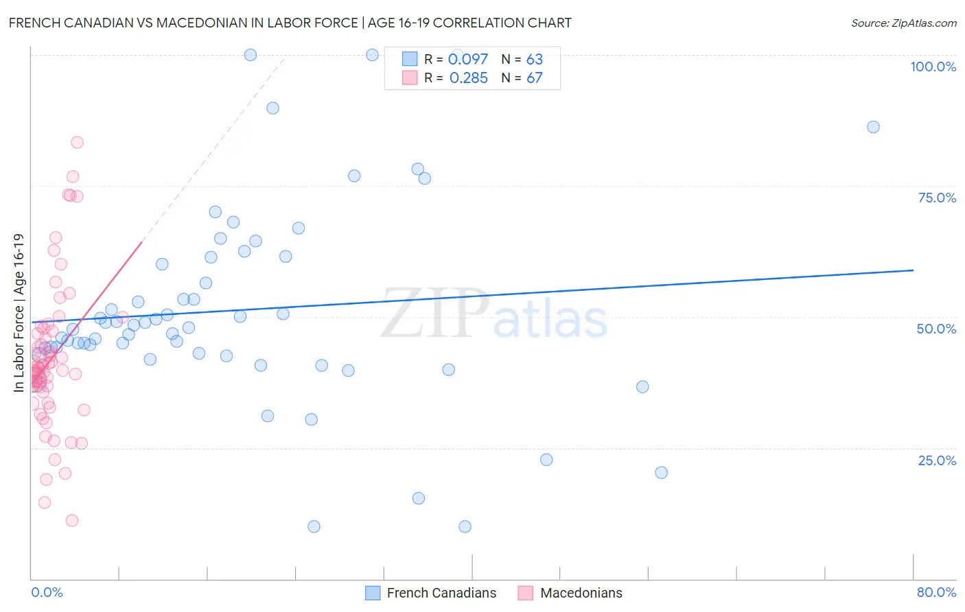 French Canadian vs Macedonian In Labor Force | Age 16-19 Correlation Chart