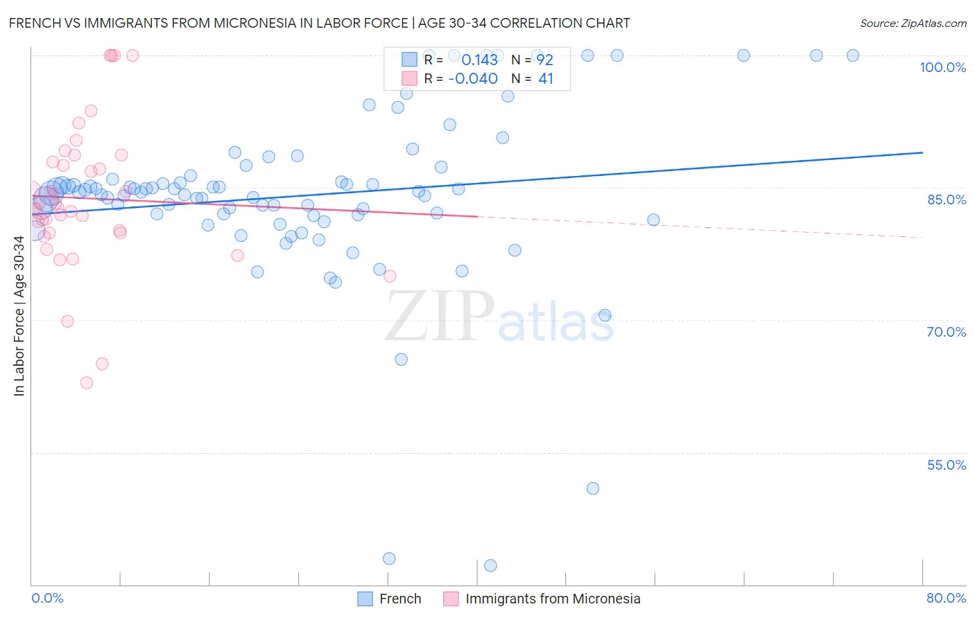 French vs Immigrants from Micronesia In Labor Force | Age 30-34 Correlation Chart