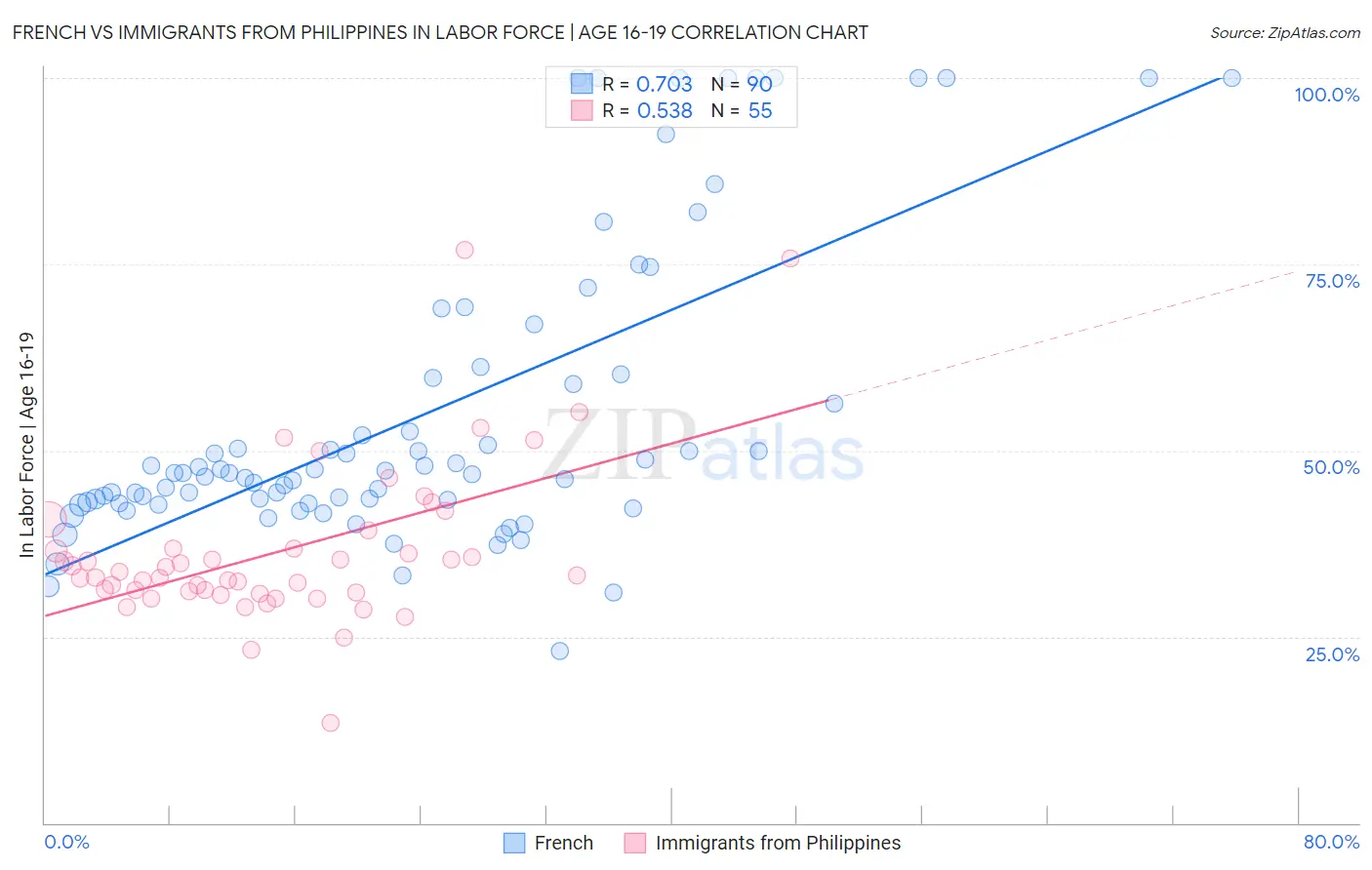 French vs Immigrants from Philippines In Labor Force | Age 16-19 Correlation Chart
