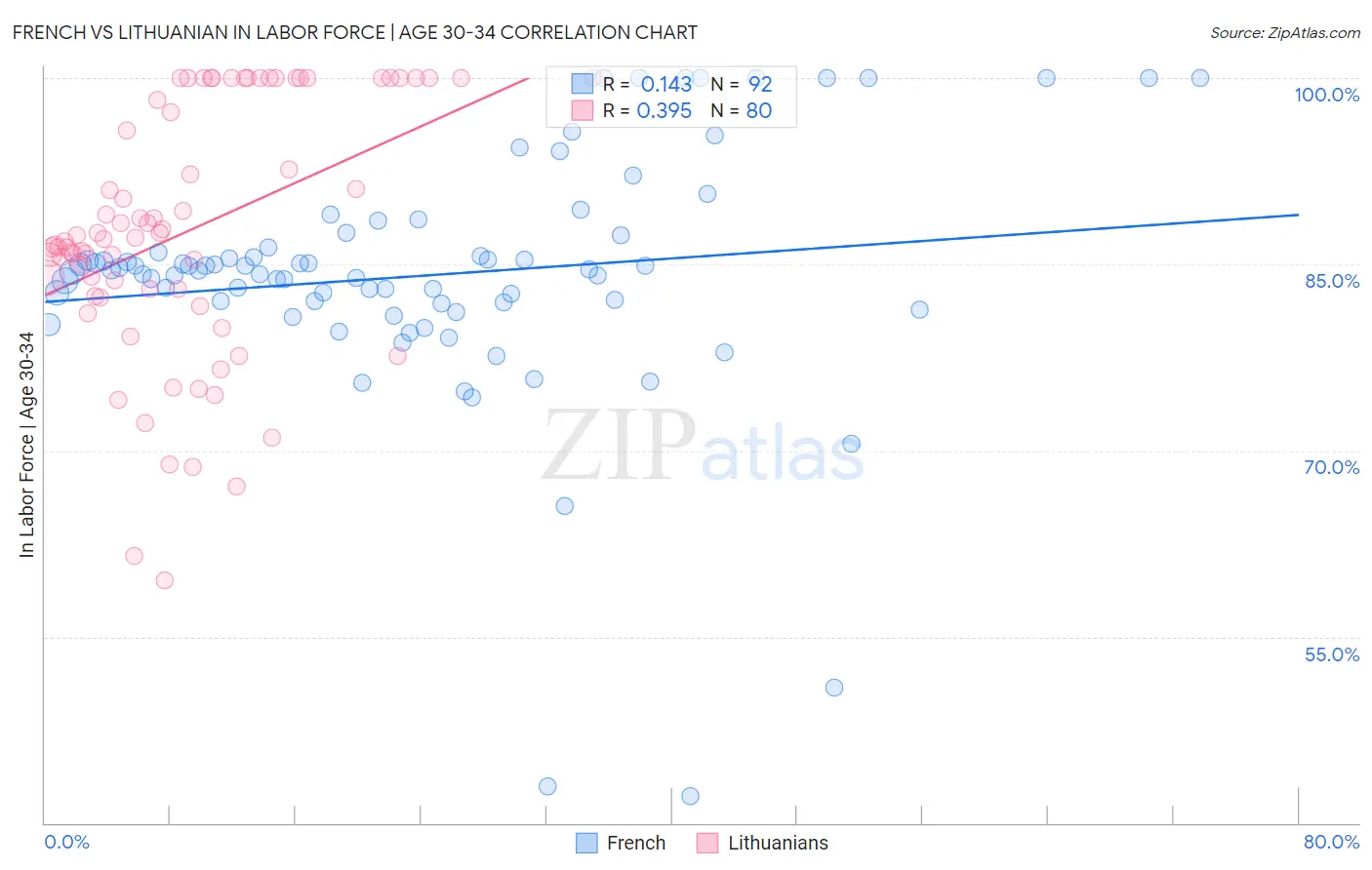 French vs Lithuanian In Labor Force | Age 30-34 Correlation Chart