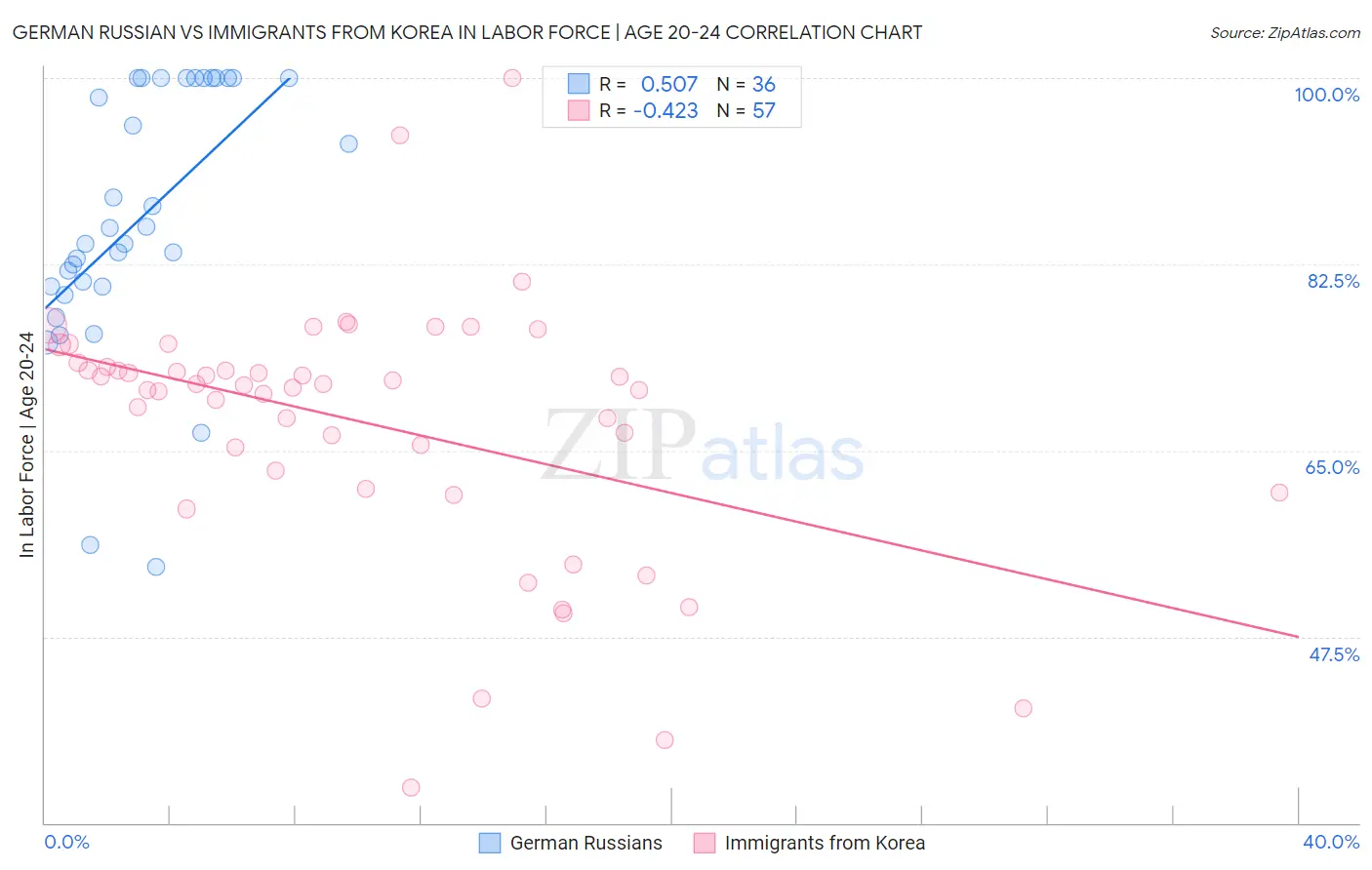 German Russian vs Immigrants from Korea In Labor Force | Age 20-24 Correlation Chart