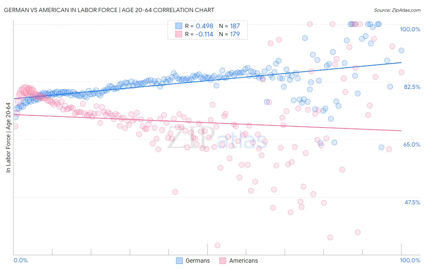 The statistical analysis conducted on geographies consisting of 581,278,345 people shows a moderate positive correlation between the proportion of Germans and labor force participation rate among population between the ages 20 and 64 in the United States with a correlation coefficient (R) of 0.498 and weighted average of 79.7%. Similarly, the statistical analysis conducted on geographies consisting of 581,969,133 people shows a poor negative correlation between the proportion of Americans and labor force participation rate among population between the ages 20 and 64 in the United States with a correlation coefficient (R) of -0.114 and weighted average of 77.0%, a difference of 3.4%.