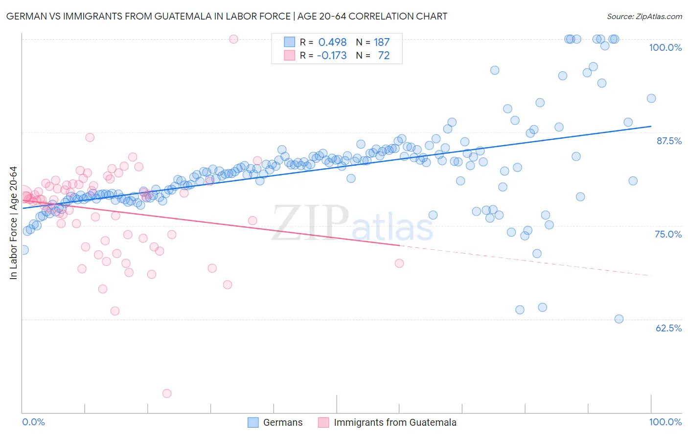 German vs Immigrants from Guatemala In Labor Force | Age 20-64 Correlation Chart