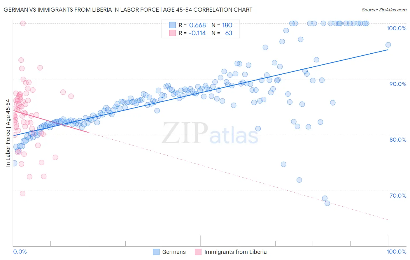 German vs Immigrants from Liberia In Labor Force | Age 45-54 Correlation Chart