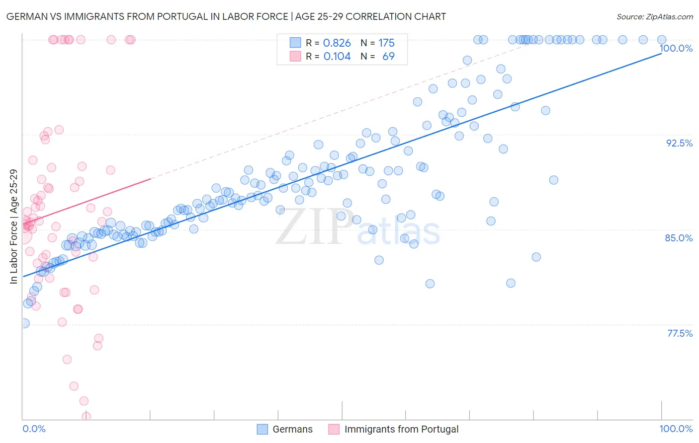 German vs Immigrants from Portugal In Labor Force | Age 25-29 Correlation Chart