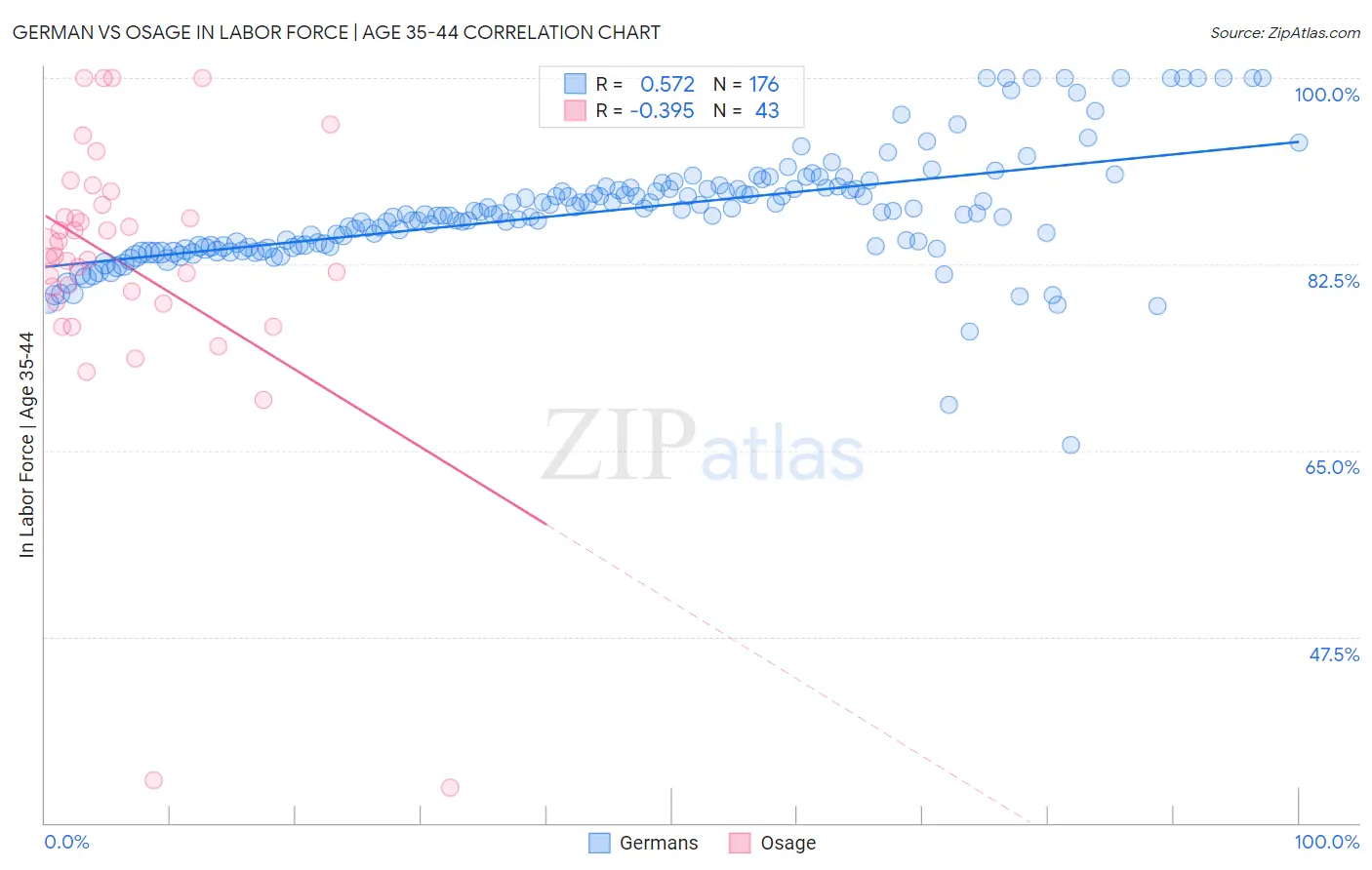 German vs Osage In Labor Force | Age 35-44 Correlation Chart