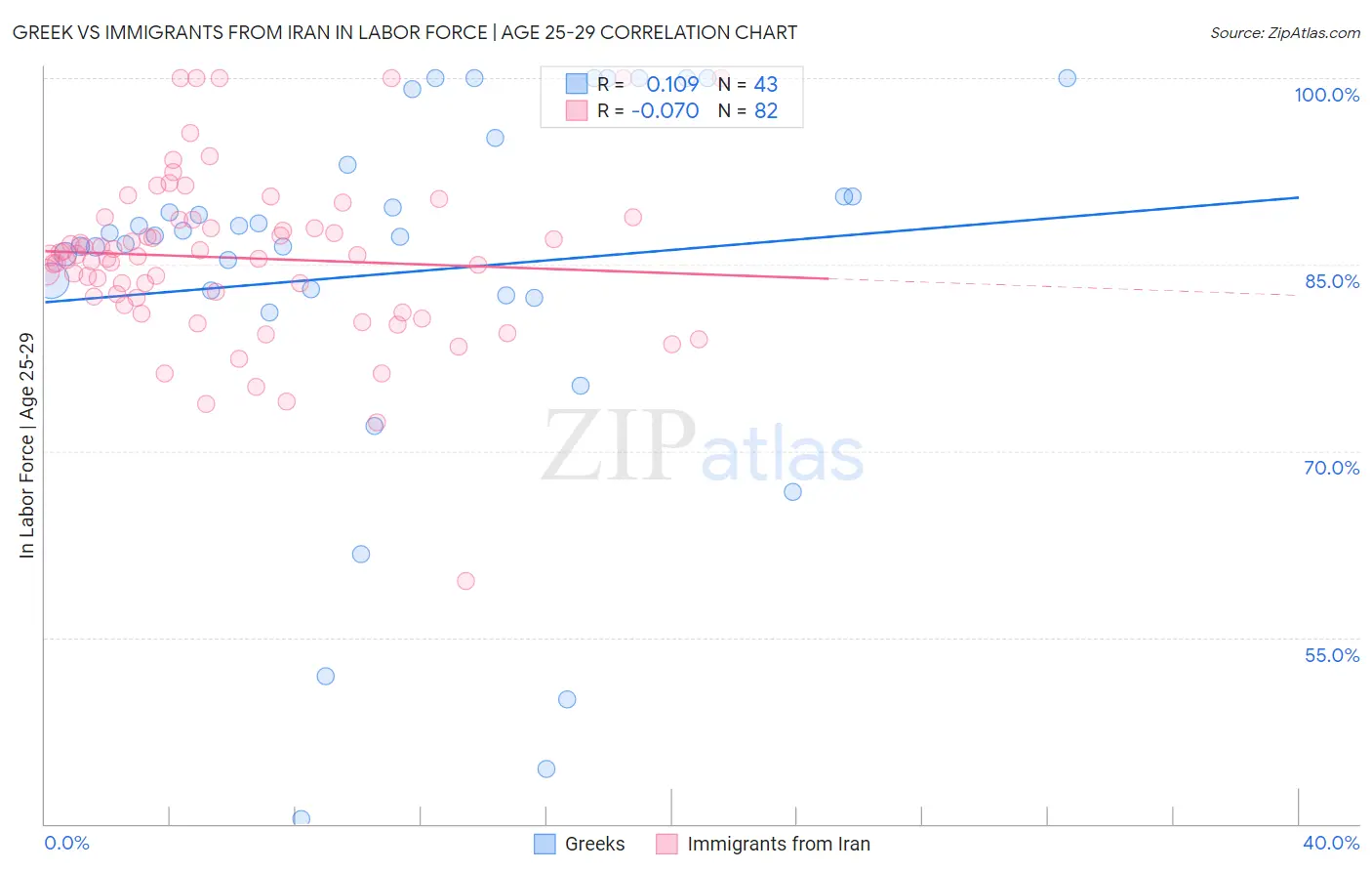 Greek vs Immigrants from Iran In Labor Force | Age 25-29 Correlation Chart