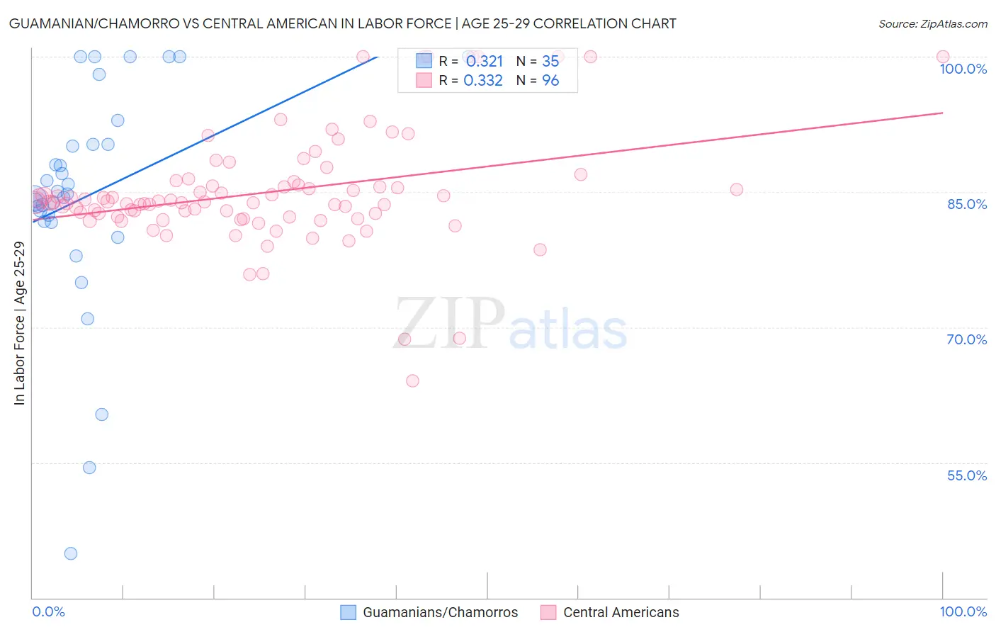 Guamanian/Chamorro vs Central American In Labor Force | Age 25-29 Correlation Chart