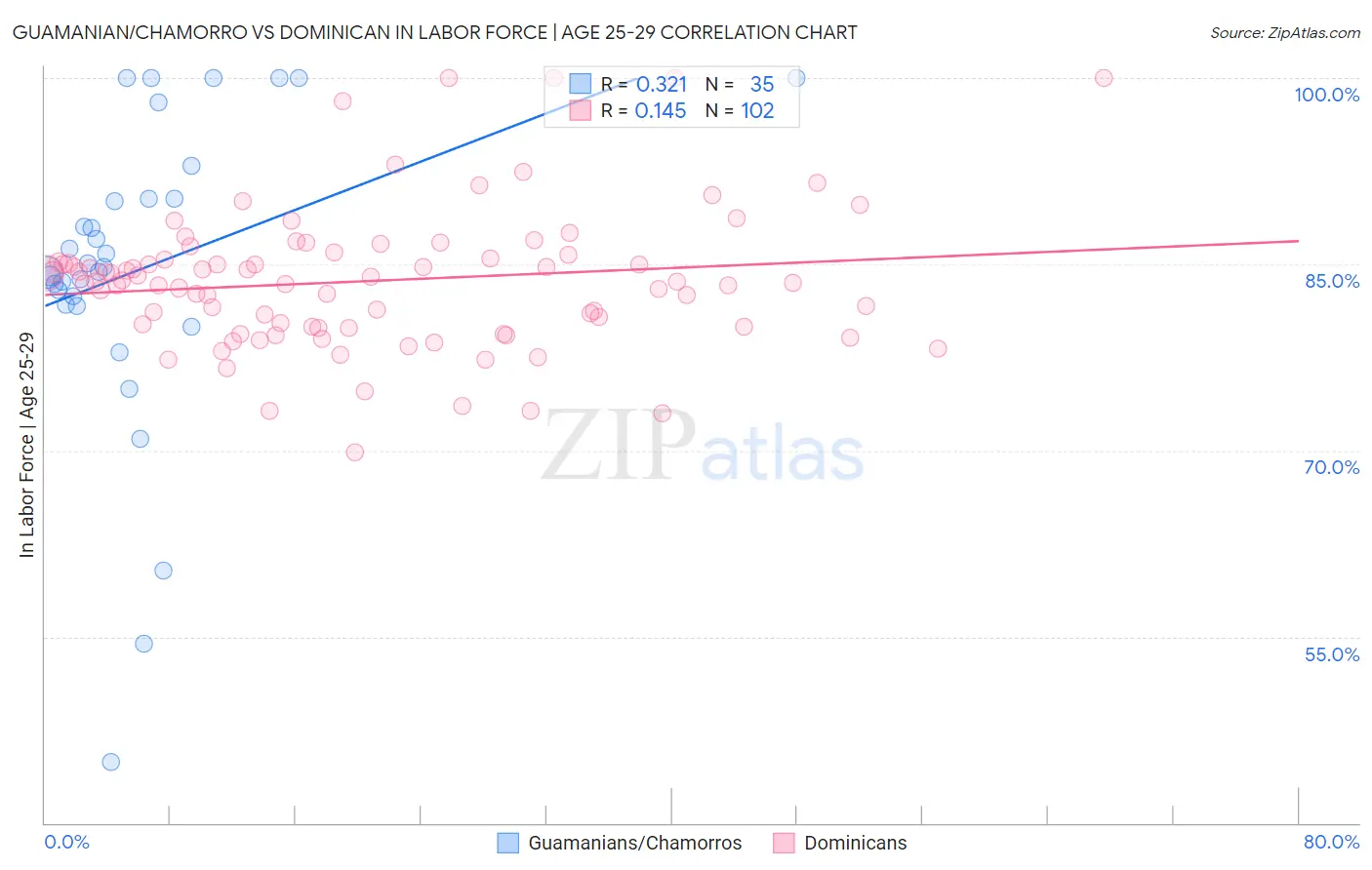 Guamanian/Chamorro vs Dominican In Labor Force | Age 25-29 Correlation Chart