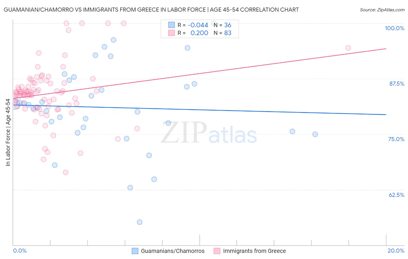 Guamanian/Chamorro vs Immigrants from Greece In Labor Force | Age 45-54 Correlation Chart