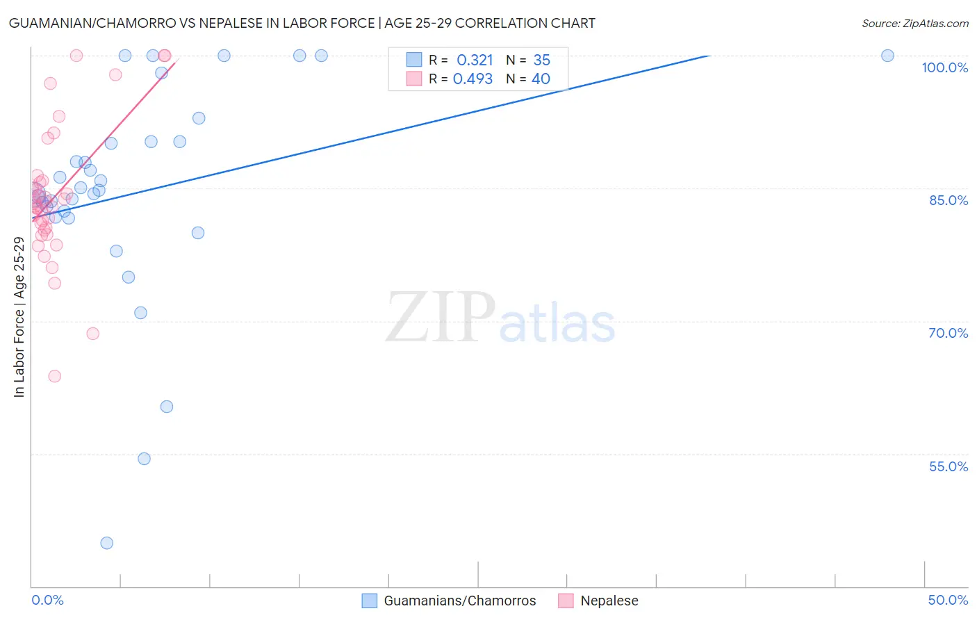 Guamanian/Chamorro vs Nepalese In Labor Force | Age 25-29 Correlation Chart