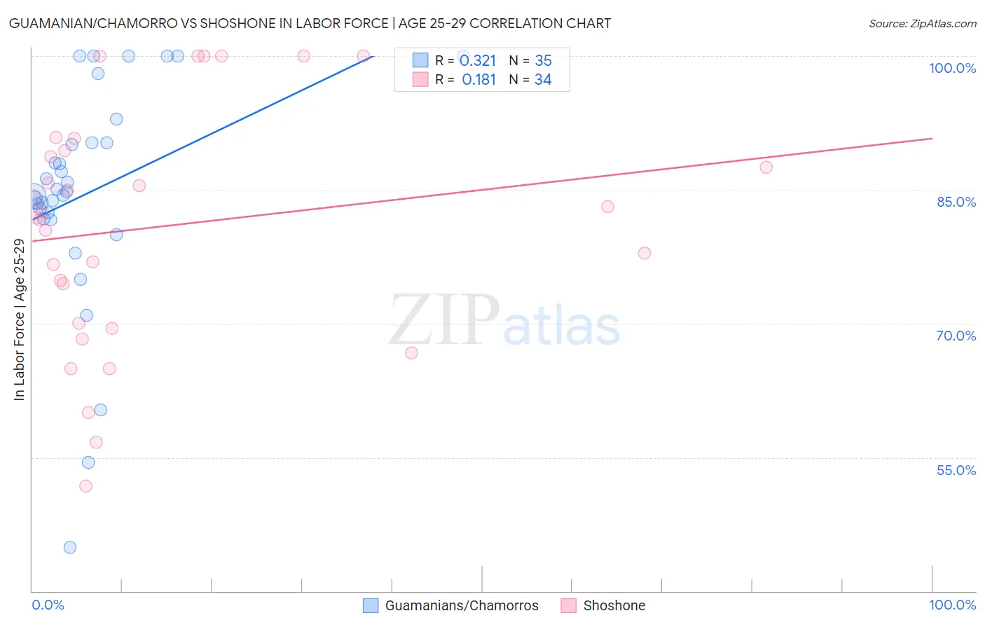 Guamanian/Chamorro vs Shoshone In Labor Force | Age 25-29 Correlation Chart