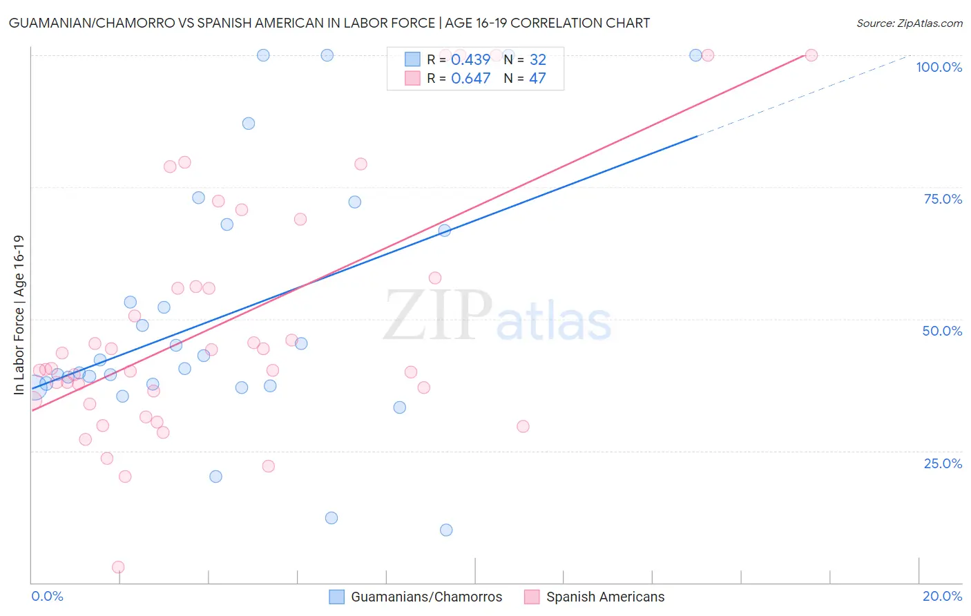 Guamanian/Chamorro vs Spanish American In Labor Force | Age 16-19 Correlation Chart