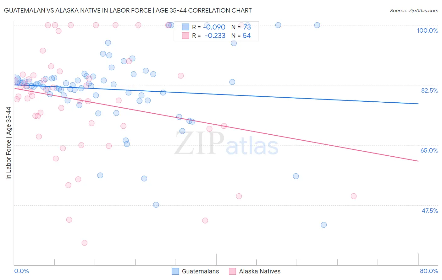 Guatemalan vs Alaska Native In Labor Force | Age 35-44 Correlation Chart