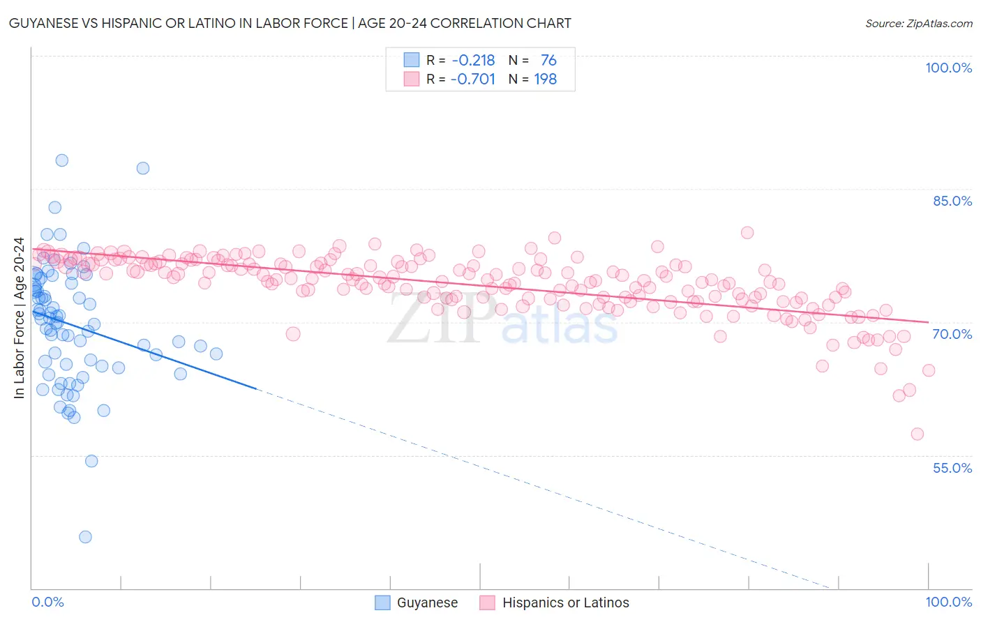 Guyanese vs Hispanic or Latino In Labor Force | Age 20-24 Correlation Chart