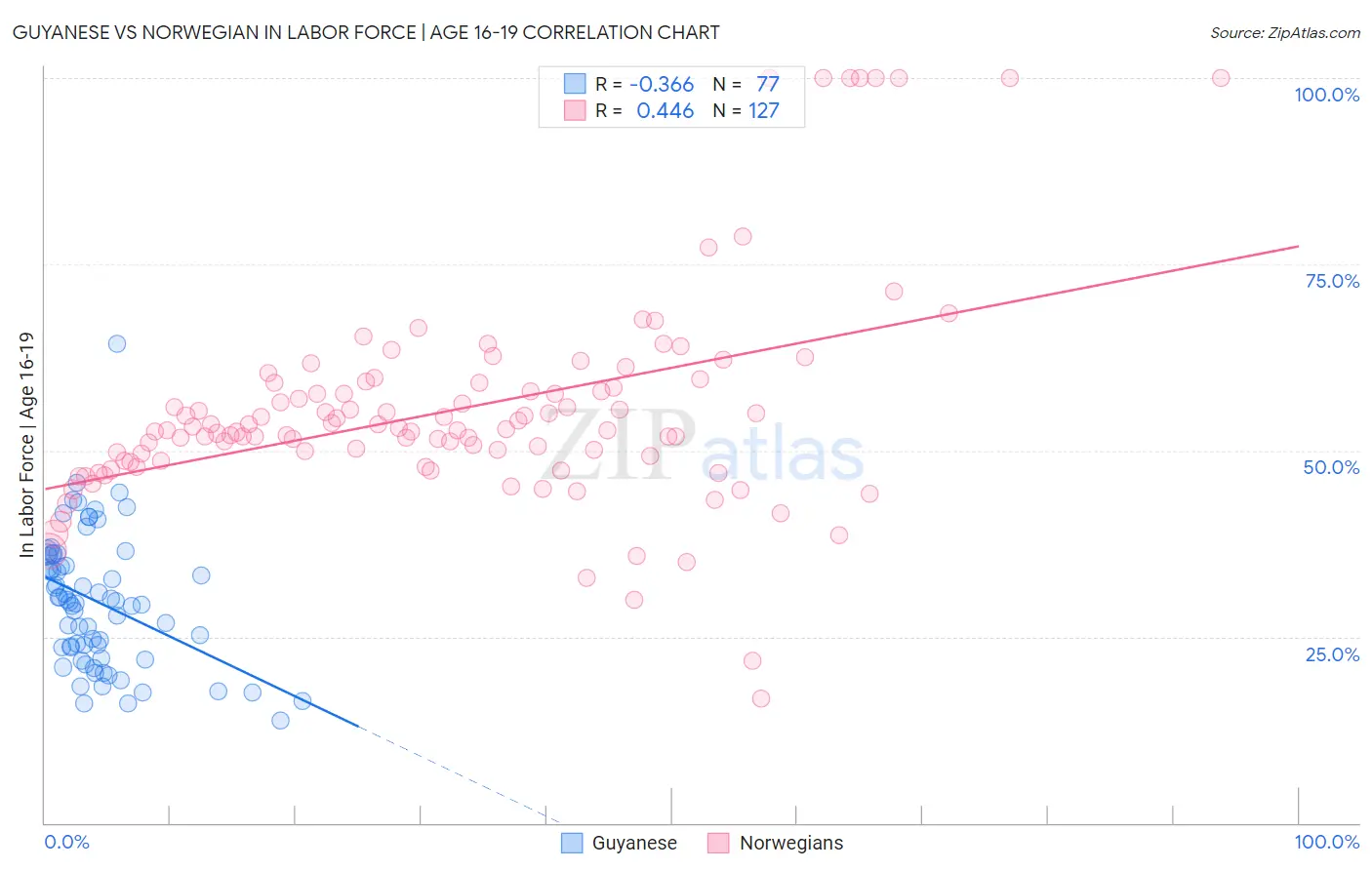 Guyanese vs Norwegian In Labor Force | Age 16-19 Correlation Chart