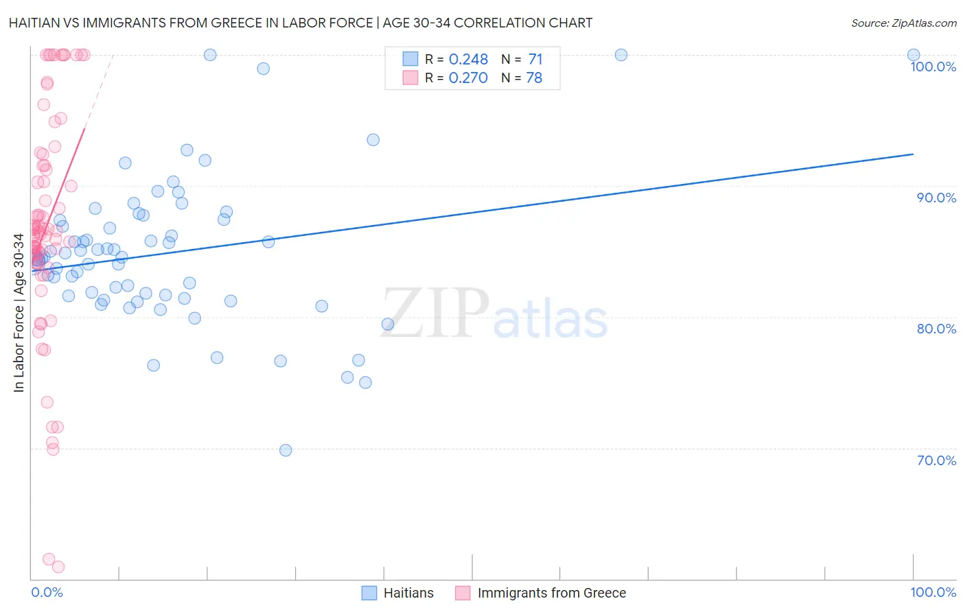 Haitian vs Immigrants from Greece In Labor Force | Age 30-34 Correlation Chart