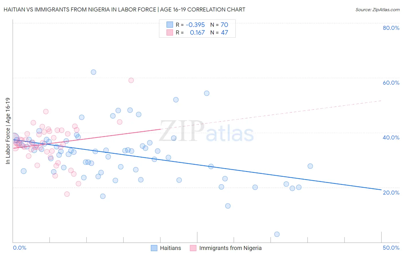 The statistical analysis conducted on geographies consisting of 287,710,811 people shows a mild negative correlation between the proportion of Haitians and labor force participation rate among population between the ages 16 and 19 in the United States with a correlation coefficient (R) of -0.395 and weighted average of 33.4%. Similarly, the statistical analysis conducted on geographies consisting of 283,352,648 people shows a poor positive correlation between the proportion of Immigrants from Nigeria and labor force participation rate among population between the ages 16 and 19 in the United States with a correlation coefficient (R) of 0.167 and weighted average of 35.8%, a difference of 7.3%.