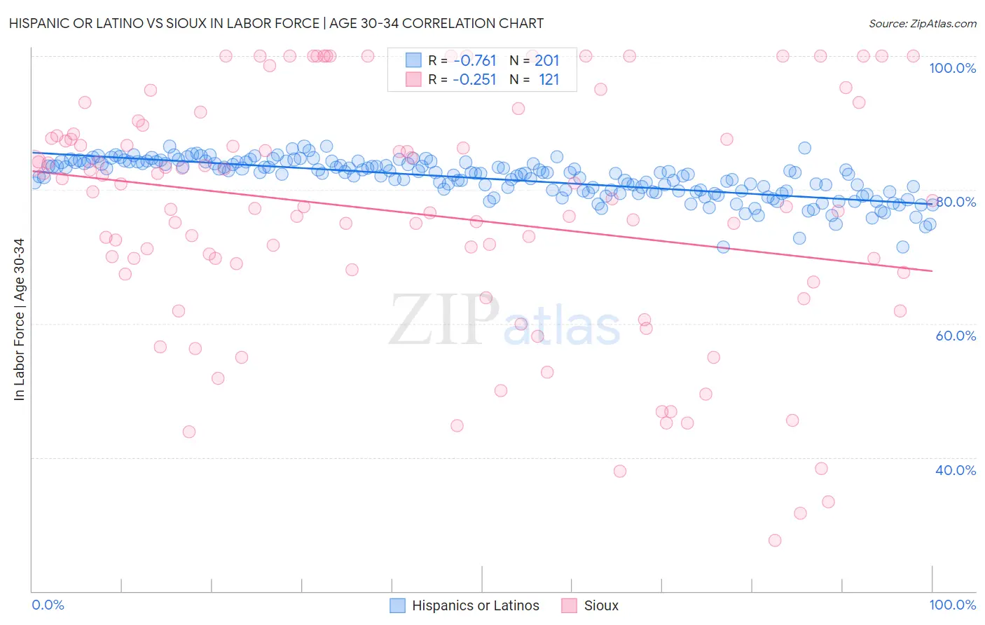 Hispanic or Latino vs Sioux In Labor Force | Age 30-34 Correlation Chart