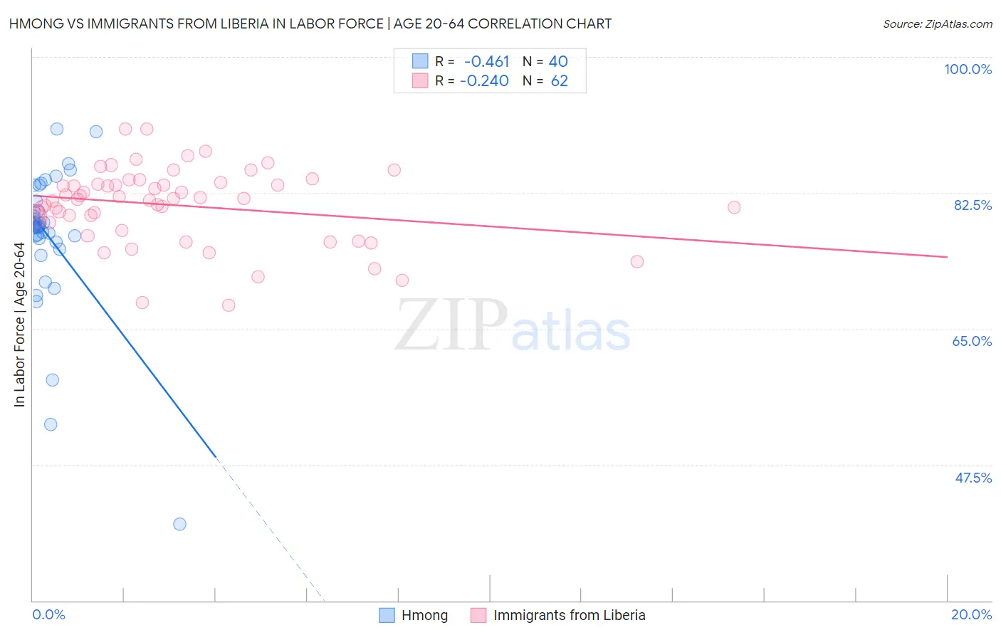 Hmong vs Immigrants from Liberia In Labor Force | Age 20-64 Correlation Chart