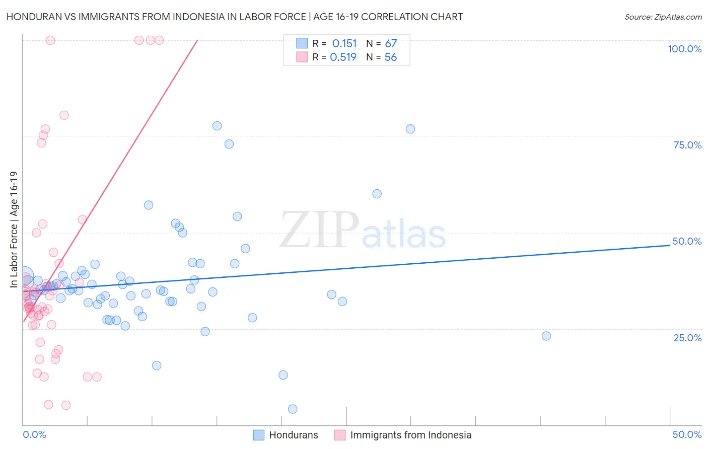 Honduran vs Immigrants from Indonesia In Labor Force | Age 16-19 Correlation Chart