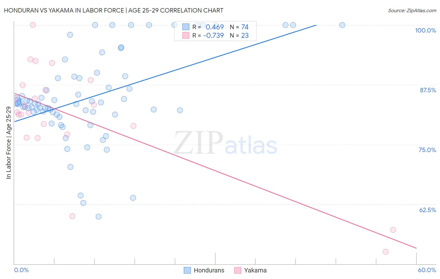 Honduran vs Yakama In Labor Force | Age 25-29 Correlation Chart