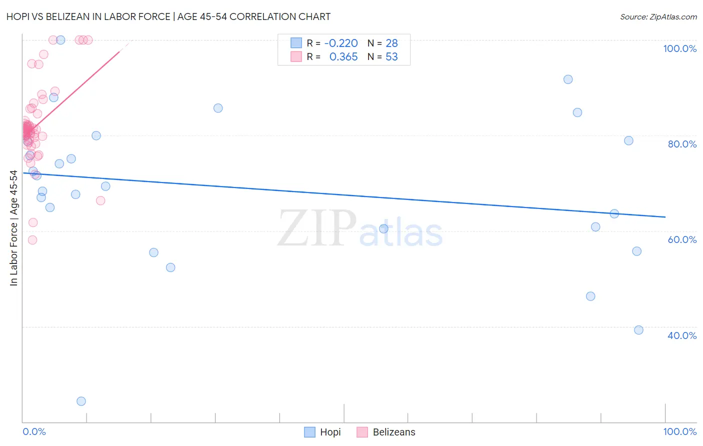 Hopi vs Belizean In Labor Force | Age 45-54 Correlation Chart