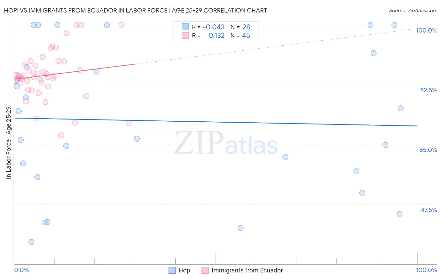 Hopi vs Immigrants from Ecuador In Labor Force | Age 25-29 Correlation Chart