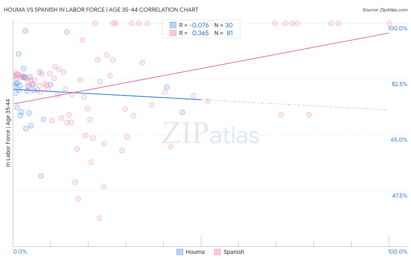 Houma vs Spanish In Labor Force | Age 35-44 Correlation Chart