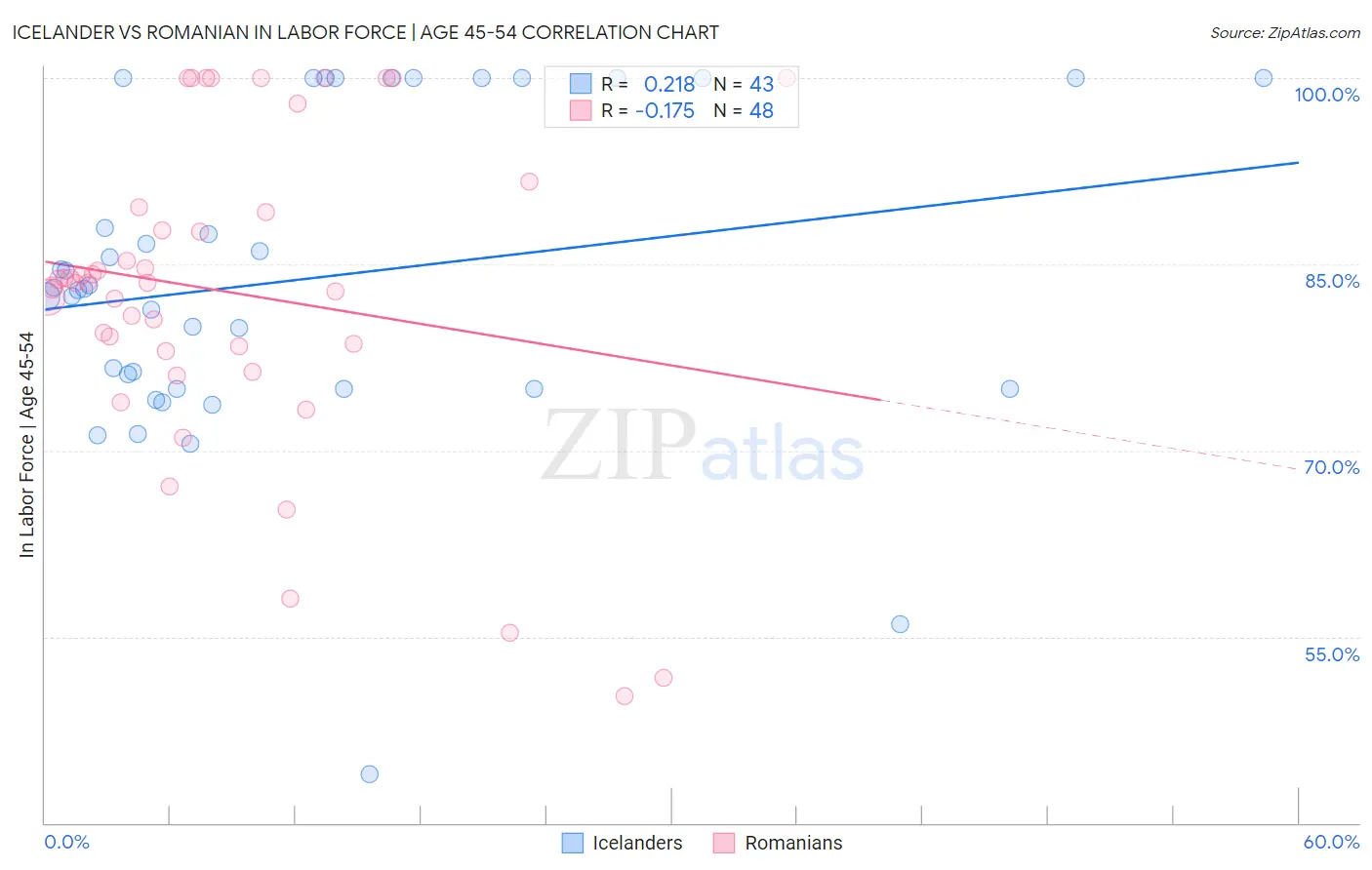 Icelander vs Romanian In Labor Force | Age 45-54 Correlation Chart