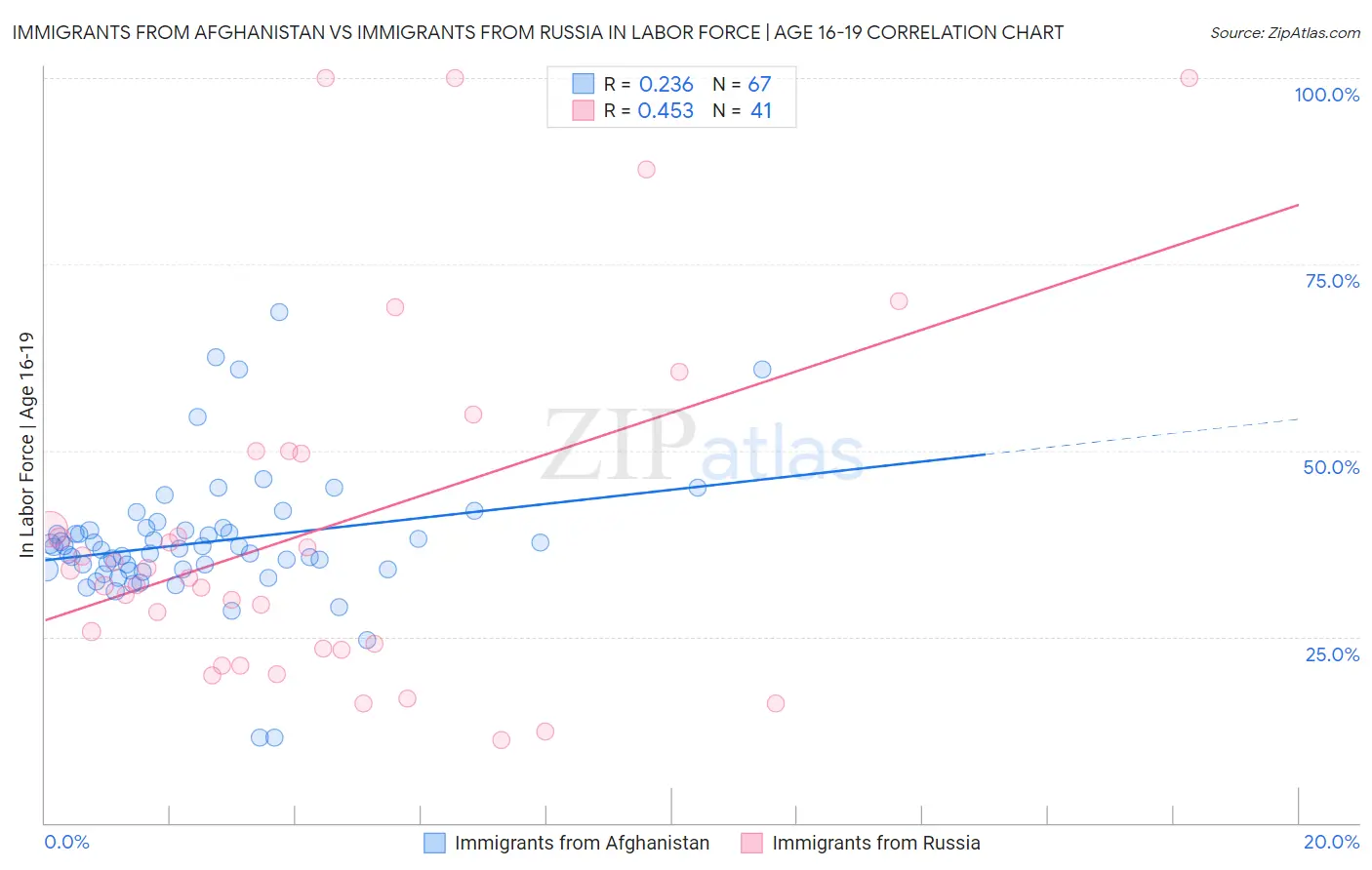 Immigrants from Afghanistan vs Immigrants from Russia In Labor Force | Age 16-19 Correlation Chart