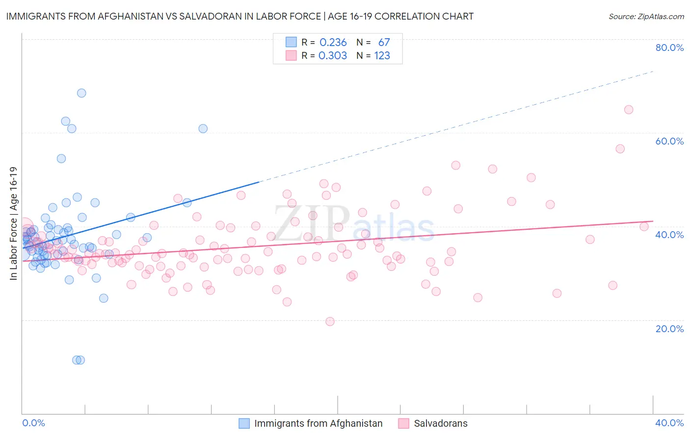 The statistical analysis conducted on geographies consisting of 147,514,090 people shows a weak positive correlation between the proportion of Immigrants from Afghanistan and labor force participation rate among population between the ages 16 and 19 in the United States with a correlation coefficient (R) of 0.236 and weighted average of 36.3%. Similarly, the statistical analysis conducted on geographies consisting of 398,452,948 people shows a mild positive correlation between the proportion of Salvadorans and labor force participation rate among population between the ages 16 and 19 in the United States with a correlation coefficient (R) of 0.303 and weighted average of 34.5%, a difference of 5.1%.