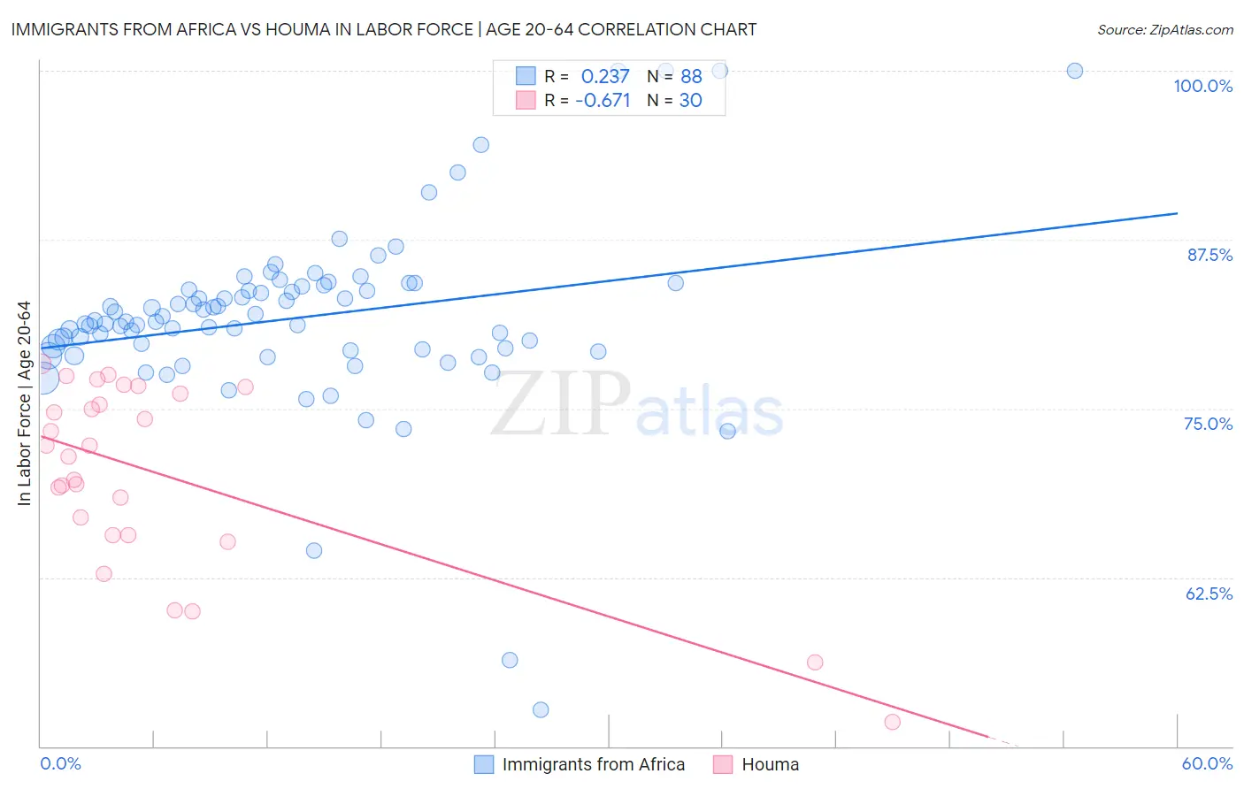 Immigrants from Africa vs Houma In Labor Force | Age 20-64 Correlation Chart