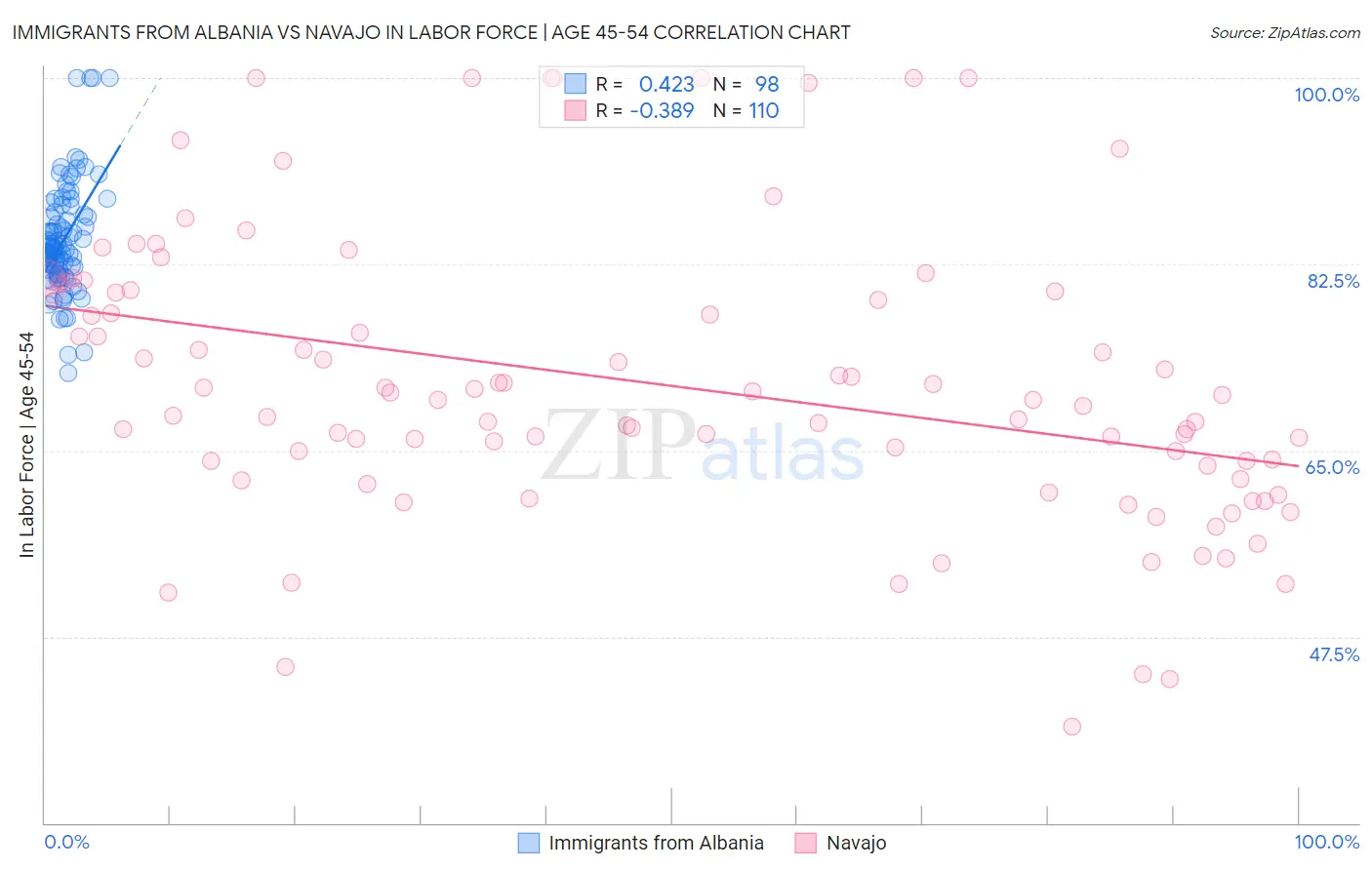 Immigrants from Albania vs Navajo In Labor Force | Age 45-54 Correlation Chart