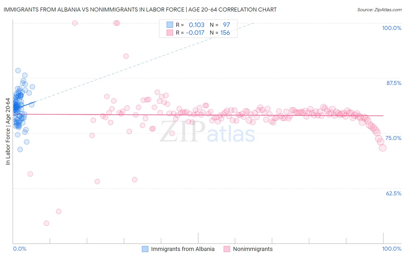 Immigrants from Albania vs Nonimmigrants In Labor Force | Age 20-64 Correlation Chart