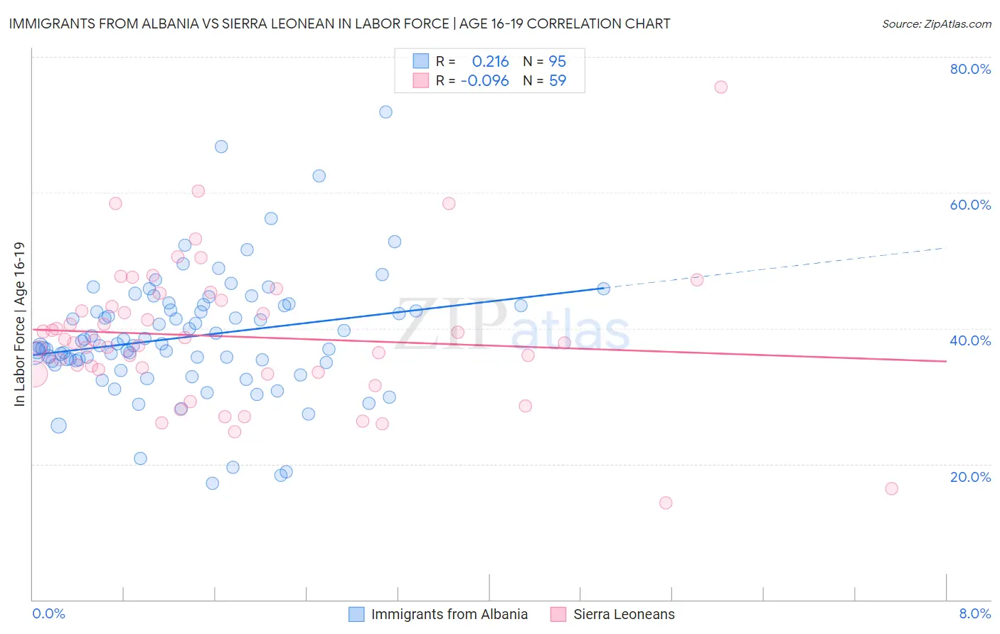 Immigrants from Albania vs Sierra Leonean In Labor Force | Age 16-19 Correlation Chart