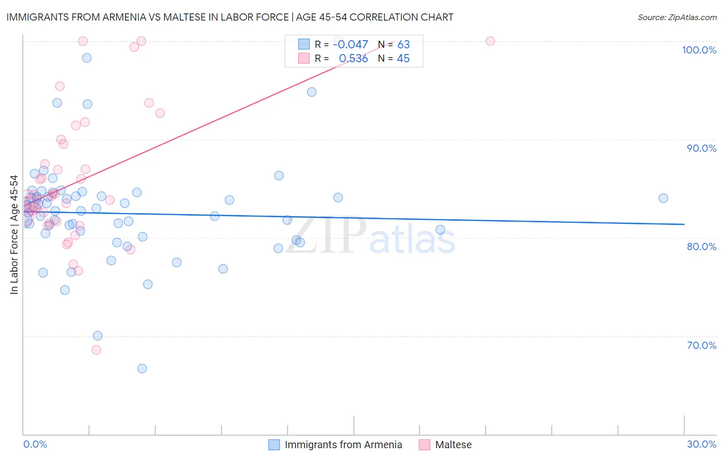 Immigrants from Armenia vs Maltese In Labor Force | Age 45-54 Correlation Chart