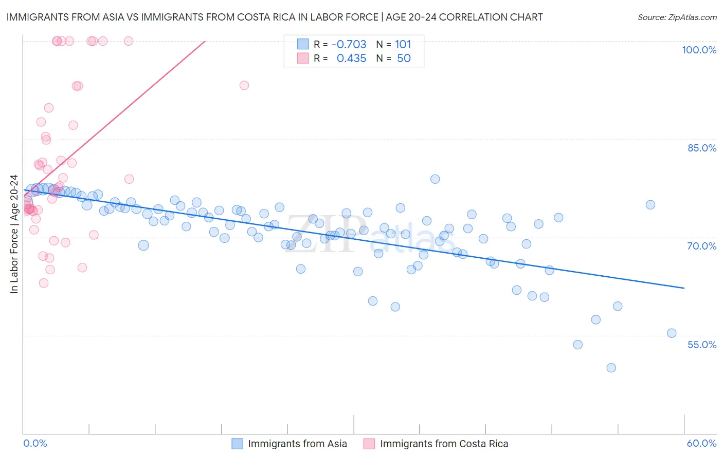 Immigrants from Asia vs Immigrants from Costa Rica In Labor Force | Age 20-24 Correlation Chart
