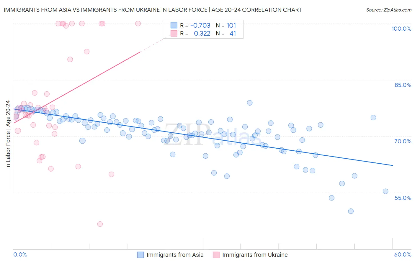 Immigrants from Asia vs Immigrants from Ukraine In Labor Force | Age 20-24 Correlation Chart