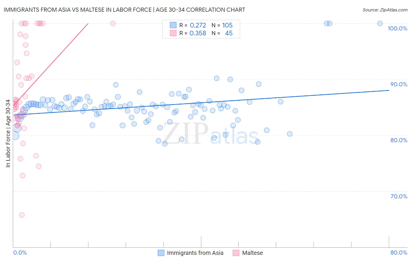 Immigrants from Asia vs Maltese In Labor Force | Age 30-34 Correlation Chart