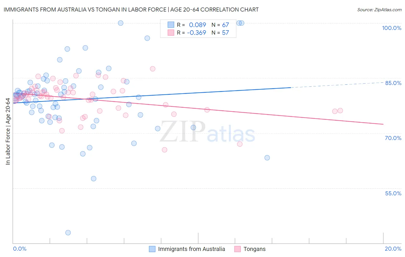 Immigrants from Australia vs Tongan In Labor Force | Age 20-64 Correlation Chart
