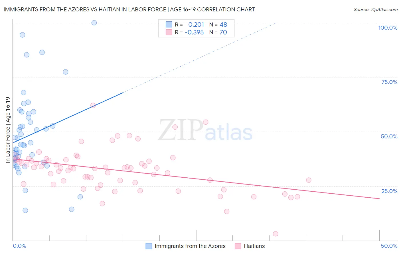 Immigrants from the Azores vs Haitian In Labor Force | Age 16-19 Correlation Chart