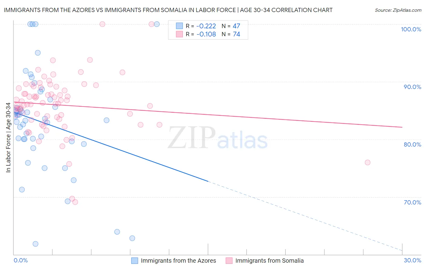 Immigrants from the Azores vs Immigrants from Somalia In Labor Force | Age 30-34 Correlation Chart