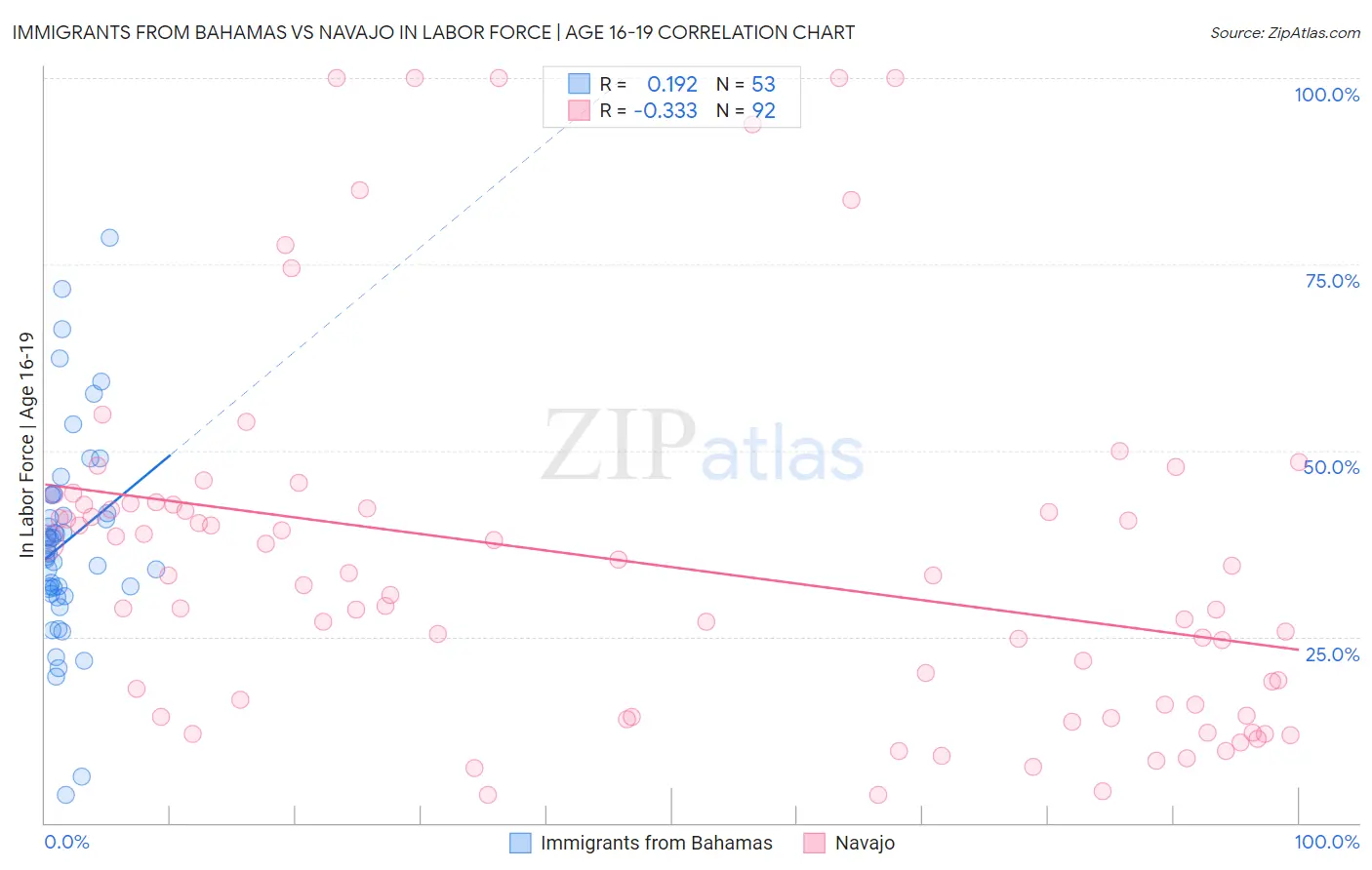 Immigrants from Bahamas vs Navajo In Labor Force | Age 16-19 Correlation Chart