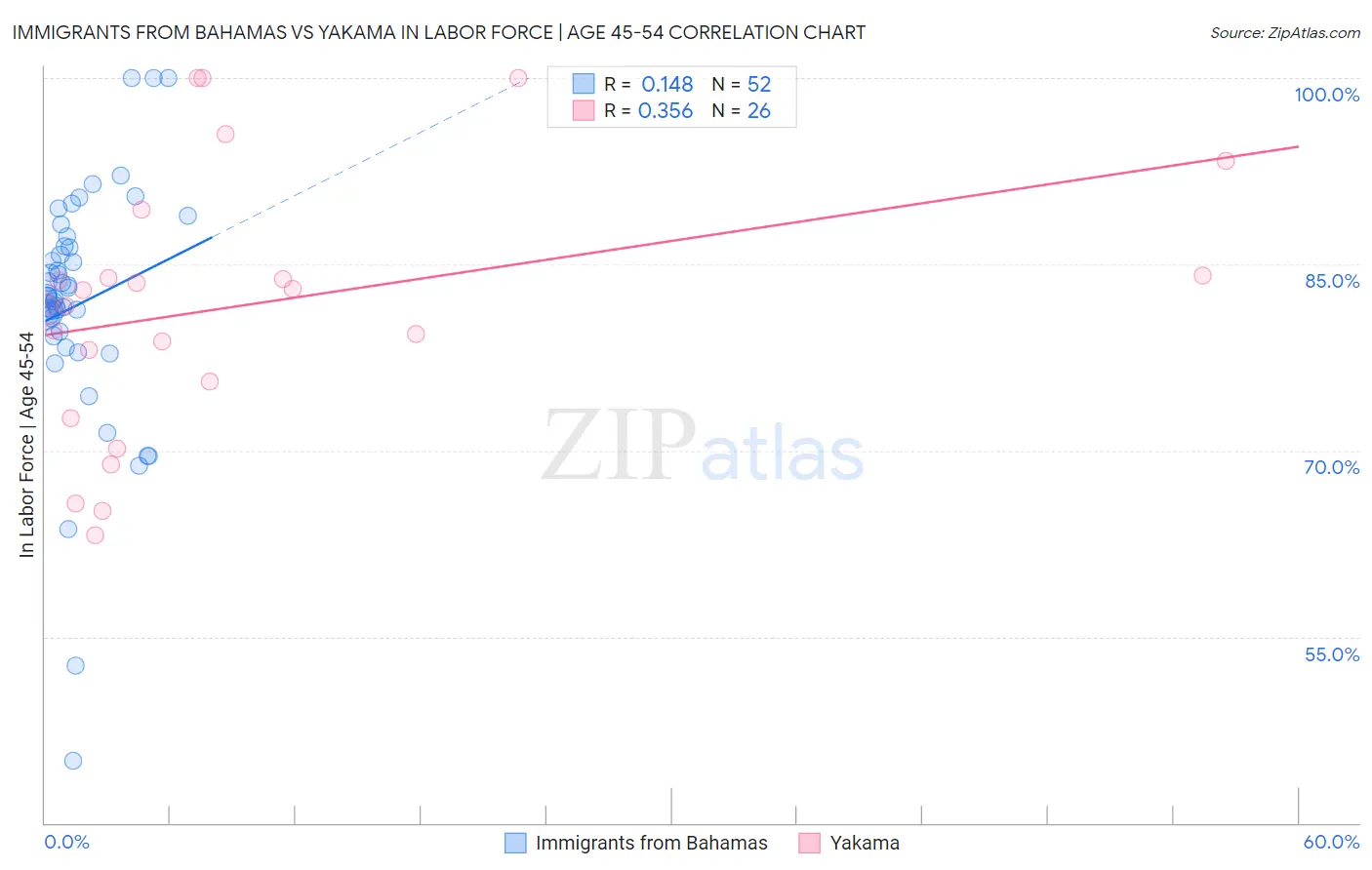 Immigrants from Bahamas vs Yakama In Labor Force | Age 45-54 Correlation Chart