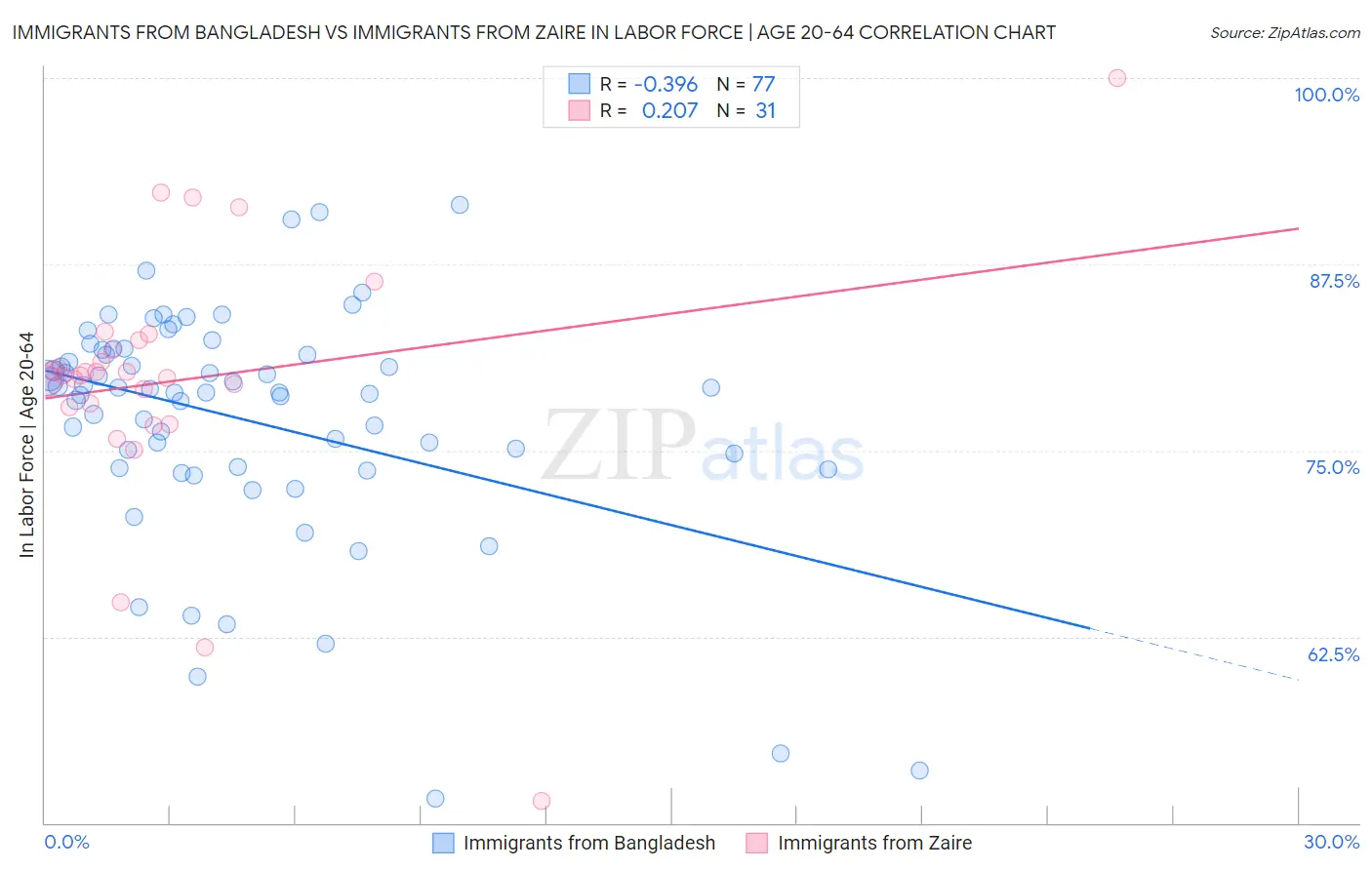 Immigrants from Bangladesh vs Immigrants from Zaire In Labor Force | Age 20-64 Correlation Chart